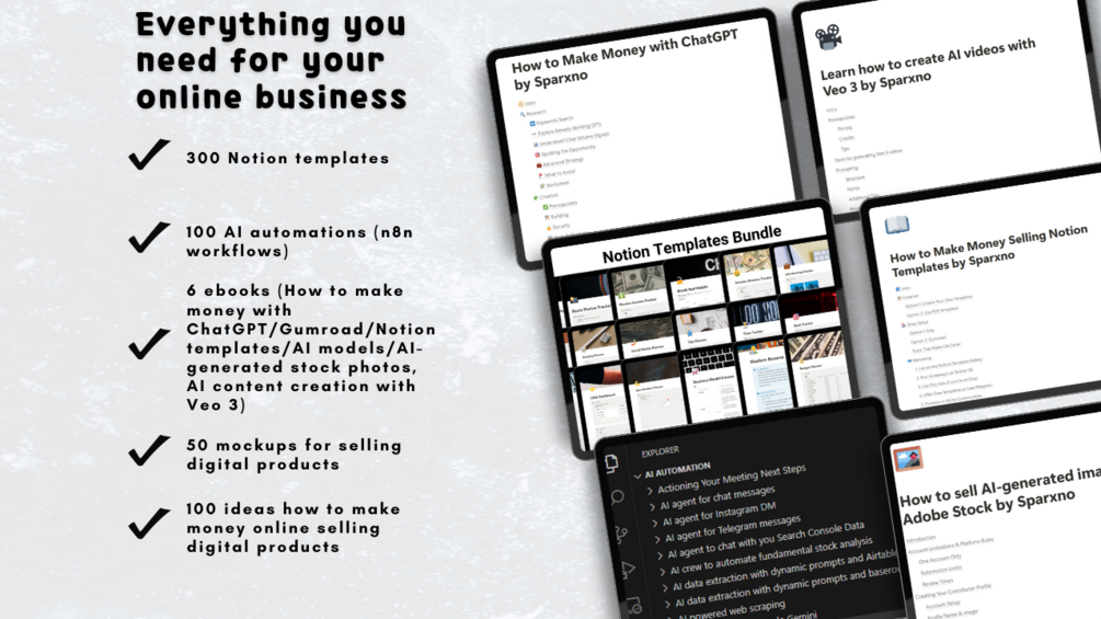 - 6 ebooks (Learn how to make money with ChatGPT, AI models, AI-generated stock photos, Gumroad, Notion templates, AI content creation with Veo 3)